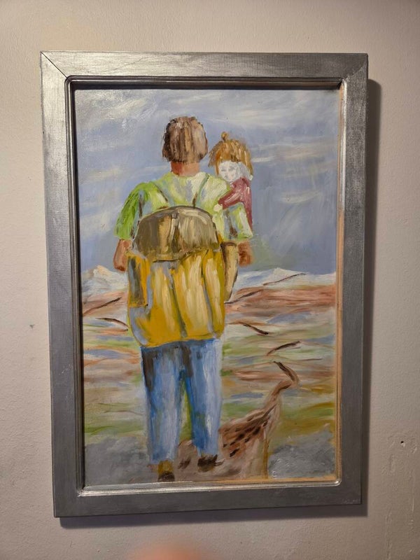 This painting I madd with oil and spraypaint . It is the story about a kid and his father that is a refuge .